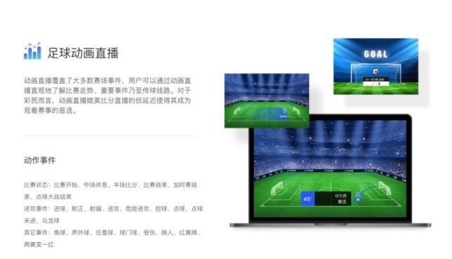 新版的动画直播可以对球场上绝大多数的赛场事件进行动作模拟,包括进球、角球、越位、边线球、换人等,大大的提升了用户在观看比赛时的体验。配合上极低的延迟,看球时的代入感十足,几乎犹如身临其境。