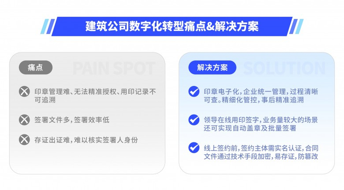 · 建筑企业签署流程长、签署人员多,传统纸质合同的签署方式,无法证实签署人的真实身份、真实意愿、以及签署后合同文本是否被进行过单方面的修改,导致后期如果出现纠纷,难以提供相应证明,影响纠纷处理效率。