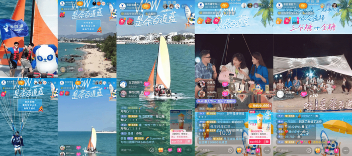 为了更好的提升观众在线观看的直播体验,茶百道实时进行机位切换取景,通过海上摩托艇、彩虹拖伞、海岸线航拍等玩法,最大程度拓宽海边场景,流畅切换展示直播场景,全景全方位彰显自然直播现场,海边景色的壮阔露出,也正好照应了“WOW,是茶百道蓝”的主题,以场景颜色的结合呼应,更容易在用户心中留下深刻印象,甚至是观看直播后,看到蓝海就会想起“茶百道”的海边直播。