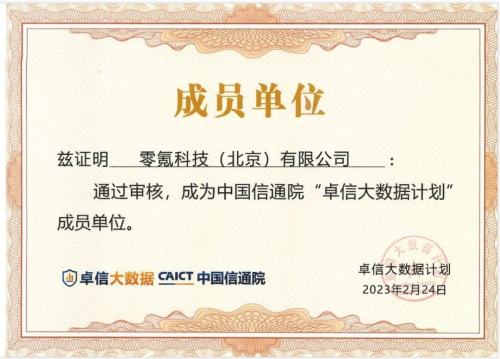 2023年2月,工信部中国信通院“2023数据安全高峰论坛”暨中国信通院卓信大数据计划年度峰会上,中国信通院对“卓信大数据计划”入选成员单位颁发证书,零氪科技作为该计划第三批入选的成员单位之一,得到国家权威机构认可。