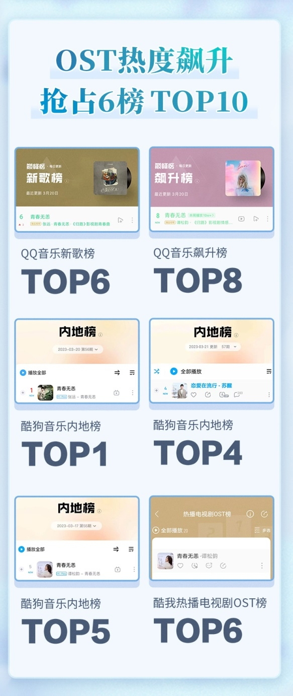 《归路》OST专辑正式发行后火速登上各大平台的榜单高位,包揽QQ音乐影视热搜TOP1和酷狗音乐影视热搜TOP3。单曲的战斗力同样不容小觑,横扫多个音乐榜单。女主角谭松韵所演唱的情感主题曲《青春无恙》,成功斩获了QQ音乐飙升榜TOP8、酷狗音乐内地榜TOP5、酷我音乐热播电视剧OST榜TOP6的亮眼成绩。张远演绎的青春曲《青春无恙》,发行仅两天便冲上QQ音乐新歌榜TOP6及流行指数榜TOP14,并登顶酷狗音乐内地榜TOP1。