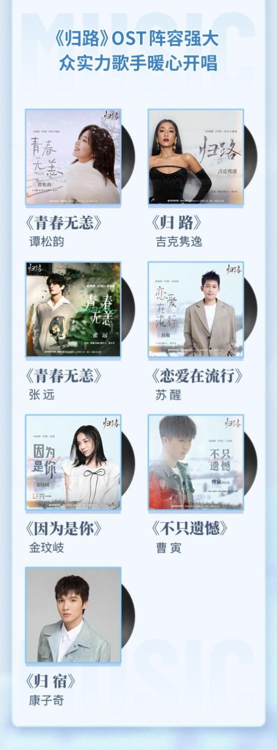 事实上,《归路》这张影视原声带无论是演唱者,还是幕后制作团队的阵容都相当豪华,音乐出品质量过硬,为其人气打下了坚实基础。演唱者方面,除了主演谭松韵以外,还有吉克隽逸、张远、苏醒、金玟岐、曹寅、康子奇6位实力歌手加盟,共同以歌声演绎归途之路的故事。幕后团队方面,则由曾为《人民的名义》《欢乐颂2》等热门影视剧创作OST的知名词曲创作人陈曦,以及获奖无数的音乐制作人董冬冬亲自操刀。