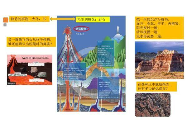 海上云老师展示了少年时68期《岩石与宝石》中的火成岩、沉积岩和变质岩的图片,让孩子展开想象,有人回答“化石”、“巧克力蛋糕”、“五花肉”,把岩石和我们生活中常见的物品联系起来,这就是想象力的作用。