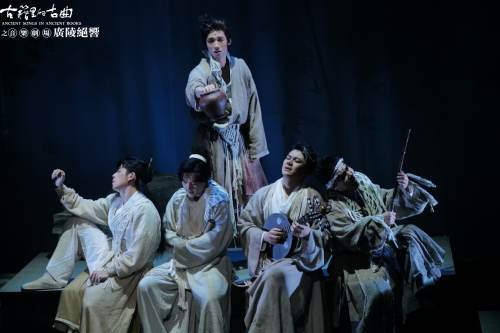 音乐剧场《广陵绝响》通过探索竹林七贤故事的现代表达,为舞台赋予了个性化视听感受和无限遐想的空间。开场,音乐剧演员高杨饰演的向秀,以一曲琴歌将观众带回魏晋时期,摇曳的竹林明暗不定,营造出动荡不安的气氛。青年古琴演奏家杨茜不时抚琴弄弦,古意葱茏的《风入松》、知音相遇的《流水》、和煦明媚的《白雪》、酒醉酩酊的《酒狂》、慷慨激昂戈矛纵横的《广陵散》等经典琴曲贯穿全剧。打击乐演奏家田薇以舞台两侧的十余件打击乐器现场演奏。高杨、话剧演员郑盛聪、卢毅、兰天、郭乙桓,舞蹈演员张高健,化身为“六贤”,他们或谈或跳或吟或唱,对谈则幽默深沉,吟诵则饱含深情,舞蹈则洒脱风趣。