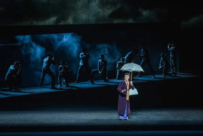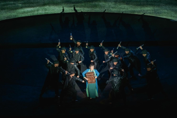 导演杨小青将越剧与歌剧结合,以一种诗化的、美丽的、时尚现代的“革命抒情”,对现代越剧艺术进行一次有个性的、“不一样的”的尝试。使用倒叙手法,作品开头首先运用歌队营造庄严氛围,再依次展开,宏大场面突破越剧惯常的“儿女情长”叙事风格,使作品呈现出恢弘、悲壮的史诗般审美品格。同时,在战争场面、特务追捕等场面中也采用了类似音乐剧的群体歌舞呈现,与越剧的抒情片段有机融为一体,使舞台呈现方式丰富多样,具有突破传统的现代感。