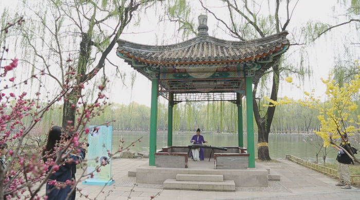 活动从散落在园中的分会场开始,在位于松风萝月、茜园两处的分会场举办了乐器演奏快闪活动,古筝、二胡、小提琴、古琴接续奏响春天的乐章,从传统到现代,文学与音乐,人文与自然在这里完美融合,不少游人在此驻足观赏,感受音乐与美景。