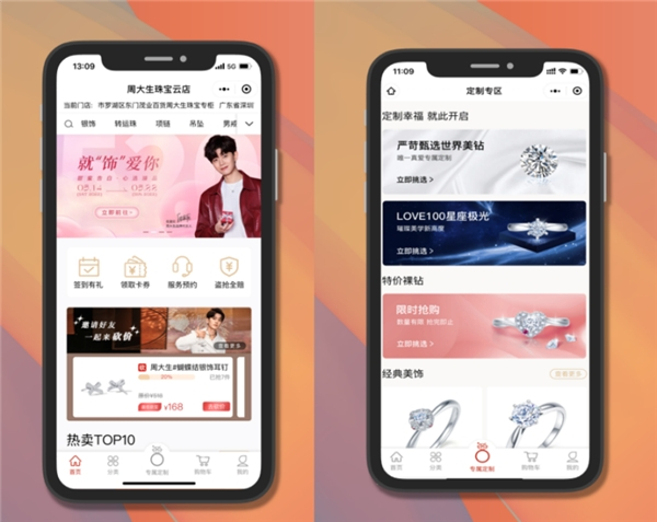 全链路:数字化极大提升门店运营效率,周大生打造从产品供应-产品定制-数字导购-会员系统-线上商城-私域触达等全链路在线化营销系统,赋能导购以专业服务及丰富产品快速响应客户需求,提高服务质量。
