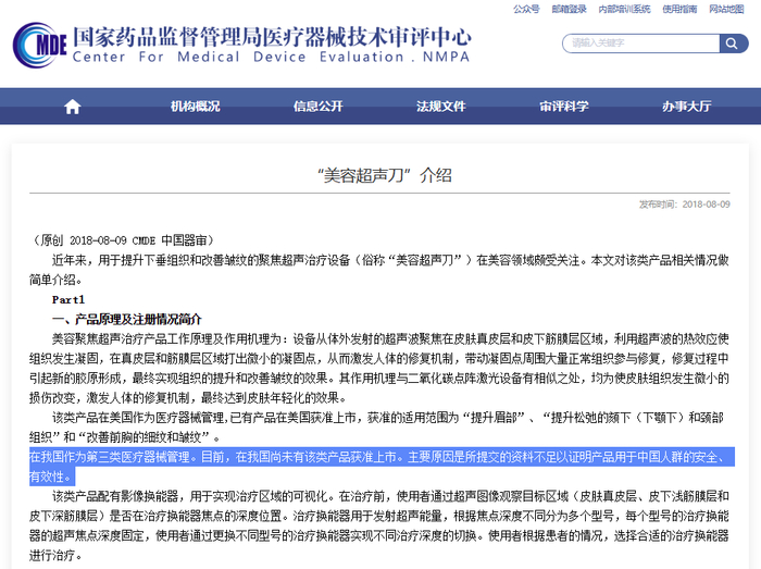 针对于DJM超声炮的介绍提及到聚焦超声技术,记者通过国家药监局医疗器械技术评审中心(CMDE)发布的一篇文章《“美容超声刀”介绍》了解到:“美容聚焦超声治疗产品发射能量高,可对组织造成损伤(凝固),因此聚焦超声治疗产品在我国是作为第三类(最高类别)医疗器械管理。直至目前,国内仍尚未有该类产品获准上市。