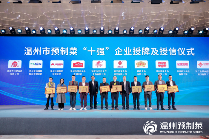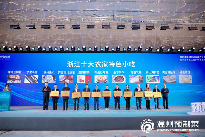 开幕式上还举行了温州市预制菜“十强”企业授牌及授信与全省十大品牌农家小吃授牌,温州预制菜“十强”企业,分别是浙江百珍堂食品有限公司、百川生物科技股份有限公司、温州快鹿集团有限公司、温州顶诺食品有限公司、瑞安华忠水产食品有限公司、浙江香海食品股份有限公司、藤桥食品有限公司、温州麦丰食品有限公司、温州修文食品有限公司、浙江金恩食品科技股份有限公司。每家“十强”企业获得中国银行温州市分行1000万元的贷款授信。进一步推动温州市农产品食品化,延长农业产业链、提升价值链、优化供应链,有效推进产业振兴、产业富民。