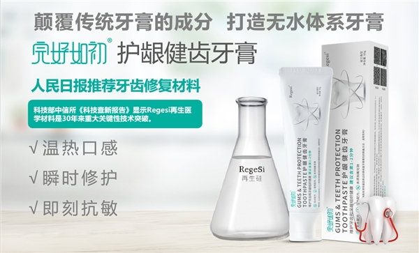 幸福益生旗下品牌完好如初牙膏,基于RegeSi再生硅为核心材料研发,可有效的修复受损的牙釉质,最高实现牙小管封闭率最高达99%,有效预防牙齿敏感,RegeSi再生硅神奇的修复功能,还可以有效缓解牙龈出血,减轻牙龈炎症。含有RegeSi再生硅的完好如初牙垢已经销售超过百万支牙膏,帮助数十万人群改善了口腔问题。