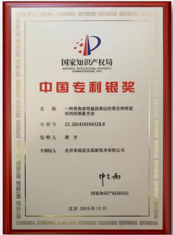 RegeSi再生硅北京幸福益生拥有独立的知识产权,并在2018年斩获中国专利银奖,是中国再生医学材料领域的重大科技突破。