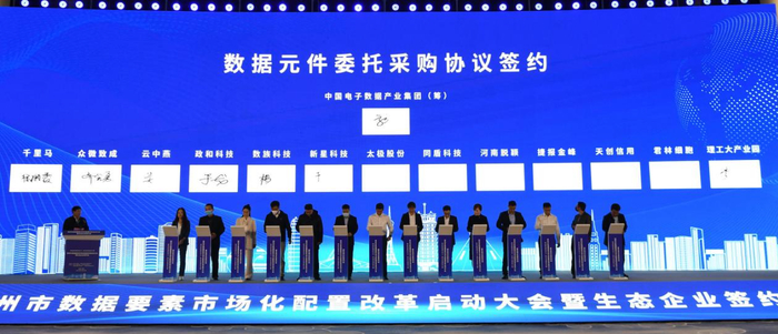 会上,中国电子数据产业集团(筹)与新星科技、河南脱颖、君林细胞等13家企业签订《数据元件委托采购协议》,凸显郑州数据元件市场空间广阔。
