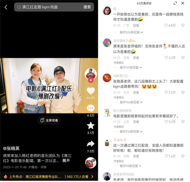 “小时候不愿听豫剧,现在听还真上头”“张老师唱出了豫剧的韵,河南的腔、中州的魂”……两小时的直播即将结束,聚集在@张晓英 抖音直播间的网友们仍不愿散去。他们在评论区点赞留言,用礼物和爱心表达着自己对豫剧的喜爱。自2019年进驻抖音以来,张晓英通过短视频和直播为网友们表演豫剧,不仅刷新了不少年轻人对传统戏曲的认知,也在网友们的点赞打赏下愈发坚定了弘扬传统文化的信心。