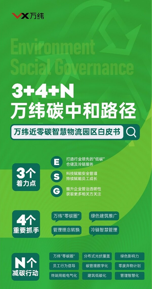 2022年12月,万纬物流正式发布《2022年近零碳智慧物流园区白皮书》,提出"科技赋能,引领园区智慧碳中和"的理念,并制定了未来的碳中和路径,致力于提升园区运营过程中的节能降耗。