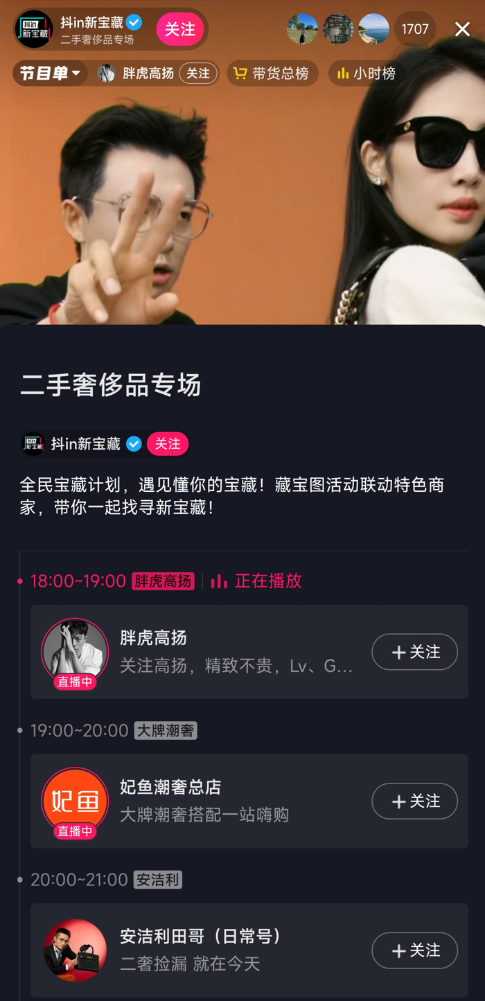 @胖虎高扬、@坚果在包展、@安洁利田哥、@集美二手奢侈品等先后进行专场直播,分别从大牌精选、潮奢穿搭、奢品折扣等不同角度带领消费者“寻宝”,从而实现从种草到购买的转化。