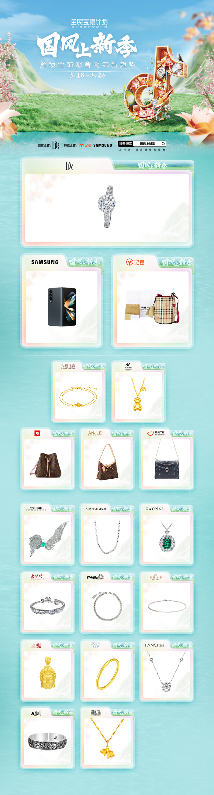 农历二月春风渐暖,春季不仅是万象更新的时节,更是重要的上新节点,人们的消费意愿也逐渐增强。尤其在春季景致影响下,带有国风元素的金饰潮奢好物备受青睐,是日常生活或结伴出行中打造早春氛围感的“加分选项”。3月18日-3月26日,抖音电商珠宝潮奢行业打造「全民宝藏计划·国风上新季」活动,依托抖音电商优质内容、丰富资源等平台优势,满足用户“焕新”需求,助力商家开启春季上新,抢占春季生意先机。
