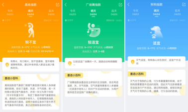 面对冬季长期居家的老小群体,墨迹天气推出晨练指数、广场舞指数、狗狗指数等针对外出活动的功能服务,综合考虑温度、风力、天气现象、空气质量等因素对中老年人和儿童的健康及户外活动的影响,提供是否适合外出活动的指数建议。帮助老小人群做好充足的外出准备,有选择地晨练、外出,这样才能保证身体不受外界不良气象条件的影响,真正达到锻炼身体的目的。