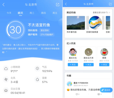 同样,在钓鱼场景下,墨迹天气也为垂钓爱好者准备了钓鱼指数。钓友在计划出行钓鱼之前,可以根据“钓鱼指数”了解当天的温度、风速、天气现象、温度日变化对垂钓的影响程度,并根据推荐饵料和老钓建议,提前做足准备。
