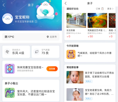 而面对亲子人群,墨迹天气还推出了亲子出行小贴士,宝爸宝妈通过完善宝宝的信息,如年龄、性别、生日等,可以获取到更符合自家宝宝的适龄推荐内容,如:推荐遛娃好去处、穿衣搭配、育娃小知识等丰富服务,一站式解决家庭亲子出行服务需求,让亲子出行更安全、更便利。