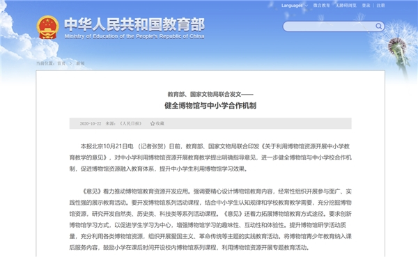 2020年10月,教育部和国家文物局联合印发的《关于利用博物馆资源开展中小学教育教学的意见》(以下简称《意见》)指出:“充分挖掘博物馆资源,研究开发自然类、历史类、科技类等系列活动课程,丰富学生知识,拓展学生视野。中小学语文、历史、地理、思想政治、美术、科学、物理、化学、生物等学科教学和综合实践活动,要有机融入博物馆教育内容。”