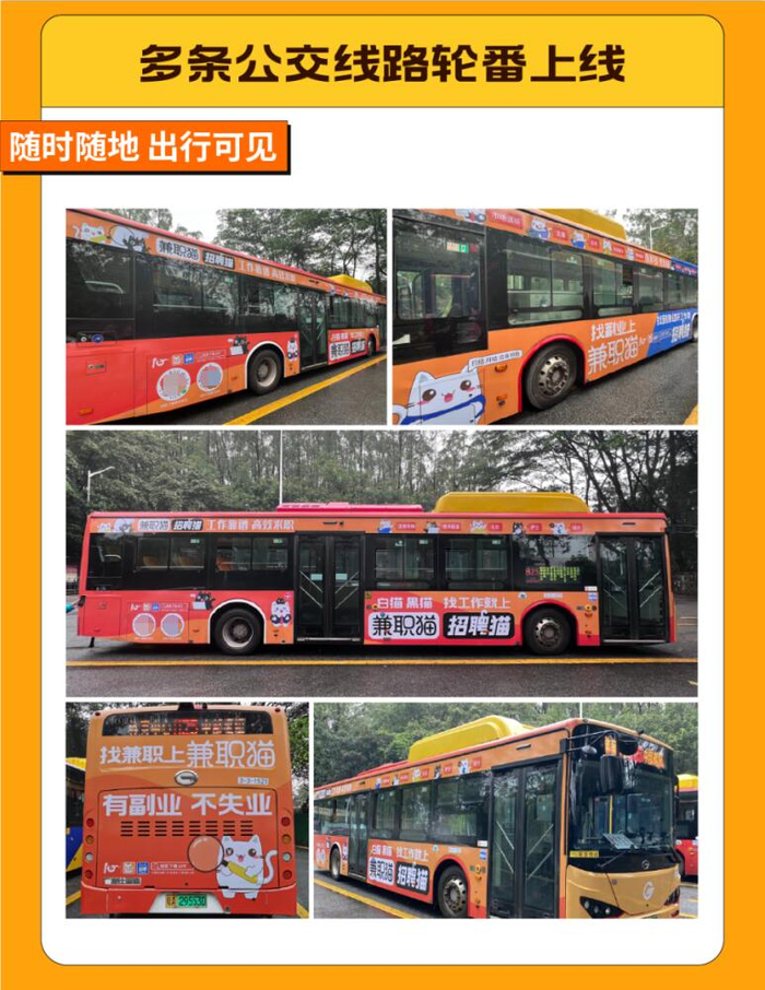 最近你可能会留意到焕然一新的公交车出没,车身上写着“白猫黑猫,找工作就上兼职猫/招聘猫”,此外,还有“工作靠谱”、“高效求职”、“有副业不失业”等宣传语,十分抢眼,在众多公交车中一眼就能认出兼职猫的萌萌造型。和以往不同,这次在兼职猫的基础上,还增加了招聘猫的曝光,联合多条公交线路轮番登场,此次广告投放预计曝光量将是亿量级,助力兼职猫和招聘猫在用户群体中持续释放品牌效应,进一步扩大品牌声量,以经营多年的口碑服务助力更多求职群体找到靠谱副业,拓宽求职渠道,从而纾解就业压力。