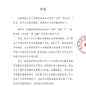4月4日下午,深受网络舆论环境恶意诋毁的杭州吾尚食品有限公司紧急发布声明,就媒体报道的“回炉‘残次品’”等相关内容做出事实澄清,呼吁广大媒体与消费者相信事实与真相。声明称,吾尚食品不存在将“残次品变身‘回料’再加工”的情况,“使用回料‘成品率’超 100%”的表述也与事实不符。