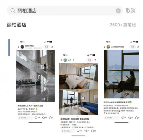其二表现为市场验证的品牌影响力。截至目前,丽柏酒店已在全球运营并筹建超过276家酒店,亚太地区共有36家酒店在营,签约超过100家门店,仅在广东和广西就先后签约16家门店。而目前已开业的门店消费者认可度颇高,迈点在小红书检索发现,平台已有超过2500+的推荐笔记,同时其商业价值也相当优秀,已开业的天津空港滨海国际机场丽柏酒店和北京通州环球度假区丽柏酒店RevPAR数据爬升迅速,十分亮眼。