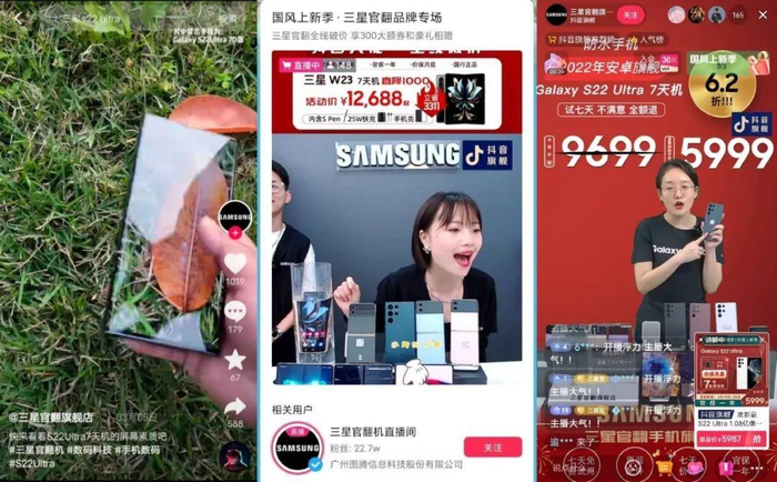具体来说,在内容场,三星官翻与明星合作短视频,露出产品,为官方自播做好引流;同时,三星官翻还参与了抖音电商平台官方的宝藏直播间活动,借力平台的势能,进一步深度种草;还与达人交个朋友直播间合作,多场域、多圈层触达用户,激发兴趣,引发购买。