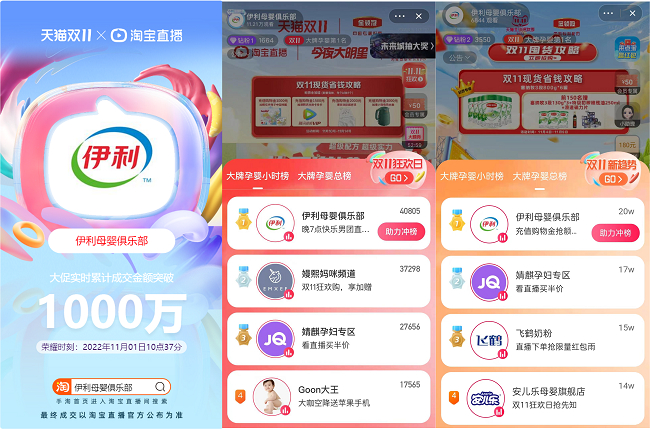 在“聚划算欢聚日”“天猫奶粉溯源”期间,金领冠还带领宝妈们体验“28天新鲜溯源行”,通过天猫直播云游伊利黄金奶源地,从源头“看见”优质营养;探索伊利全球样板工厂,了解生产标准、质量管理流程。直播互动成为金领冠与消费者深度沟通互动的平台,增进了宝妈们对金领冠专利品质的信赖,明星空降、福利抽奖等方式也给消费者带来了惊喜与福利。2022年618大促开门红、双11大促期间,金领冠直播间位列国产奶粉品牌渗透率top1。