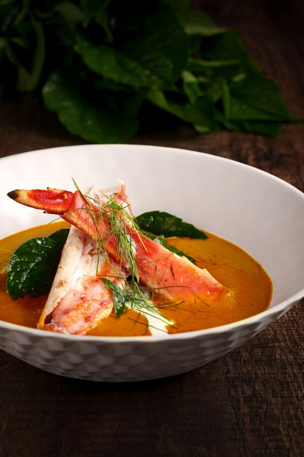 泰南风味咖哩帝王蟹 选用肉质饱满鲜嫩的阿拉斯加帝王蟹,搭配自家制香辣黄咖哩,洁白鲜嫩的蟹肉被咖哩的香味满满包裹,口味鲜香甜辣层次丰富,颜色鲜豔,让人一吃就停不下来,让嗜蟹者大呼过瘾。