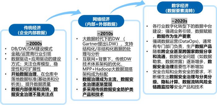 数据仓库和数据分析在世纪之初开始萌芽。彼时,数据管理能力领先的行业,如金融、运营商引领的“数据驱动+应用驱动”是主流的数据仓库建设方式。在这一时期,企业的数据分析基本上是企业内部数据,数据使用的深度、广度,以及数据流转程度不高,数据安全问题并不凸显。