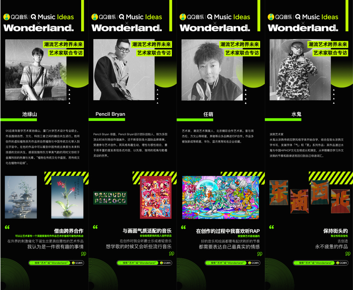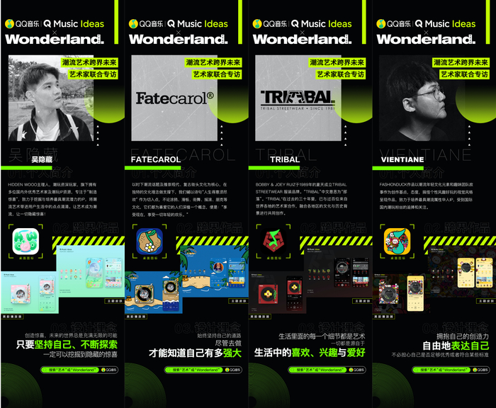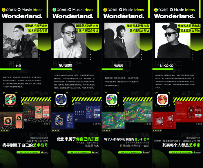 此次接受联合专访的艺术家中,谢凸、Run颜程、张呵呵、NIKOKO、吴隐藏、FATECAROL、TRIBAL、VIENTIANE都是「Q Music Ideas」的合作伙伴,就在上个月,QQ音乐上线了他们参与设计的多款艺术联名主题皮肤、黑胶播放器、桌面图标,为用户带来了音乐艺术的全新体验。