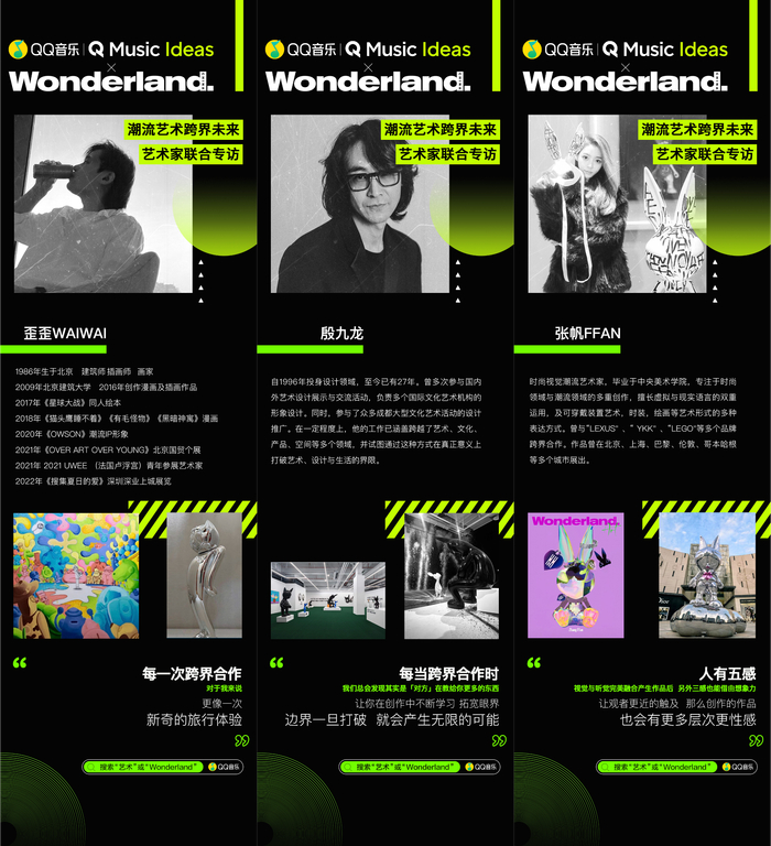 对于潮流艺术跨界,艺术家们都有着独特的观点。现在打开QQ音乐,搜索关键词“艺术”或者“Wonderland”,即可从他们精彩的对话中,感受艺术设计与音乐的有机融合所蕴含的深度思考,及其绽放的超凡魅力。
