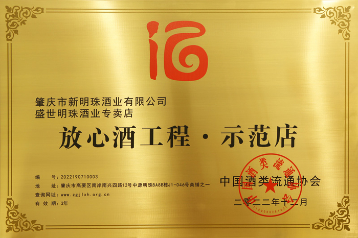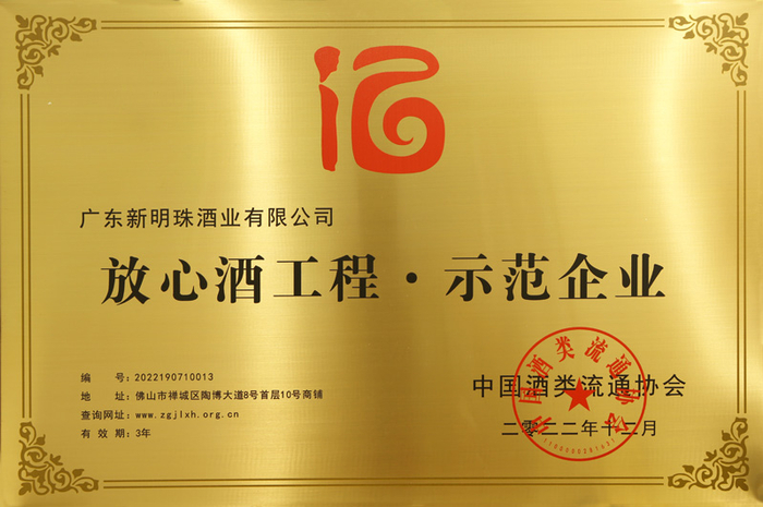 荣获“放心酒示范企业”称号的,广东省仅11家酒企;而荣获“放心酒示范店”称号的,省内仅7家酒类专卖店,这国家级荣誉称号的含金量可谓弥足珍贵。这背后满满的是中国酒业对新明珠酒业及其自有品牌盛世明珠酿造放心好酒和诚信精神传承的肯定与嘉奖。