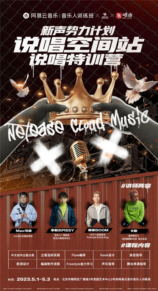 据了解,本次说唱特训营特邀IronMic全国总冠军Max马俊、地下八英里冠军爆音BOOM、张艺兴御用作词人李毅杰PISSY、《中国说唱巅峰对决》音乐总监卡斯等业界知名说唱歌手及制作人组成强大讲师阵容。他们将在5月1日至5月3日期间,为学员提供丰富多样的专业课程内容,从中文创作主题分类、立意选材实践、Flow编排、hook设计、腔调设计、编曲制作流程、Freestyle能力学习、声乐指导、录音指导、舞台表演指导等维度开启全方位的创作指导。参加特训营的学员还有机会出品战队Cypher或个人单曲,出品歌曲将收录进特训营合辑企划,并在网易云音乐平台推广。特训营上课地点位于北京市朝阳区广渠路3号竞园艺术中心网易云音乐音乐人训练班。