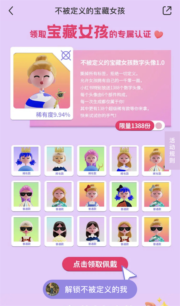 为了立体化加深参与用户的身份认同感,小红书在此次活动还新增了数字头像玩法,特别放送 1388 款数字头像,每个用户都能生成专属自己的数字头像。通过佩戴NFT女孩头像,赋予宝藏女孩独一无二身份认证。