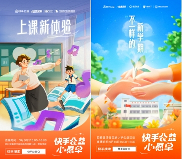 2022年3月,快手公益为辽宁省铁岭市的昌图太平中学捐赠了一台包子机,用于改善全校百名师生的早餐水平;紧接着于2022年9月,前往云南省西畴县汤谷民族小学,为学校捐赠书籍、电脑、打印机和课桌椅等物资,并在学校开展直播和员工公益活动。两场公益探访活动直播累计观看人次达到1148.5万、点赞数超过206.8万。
