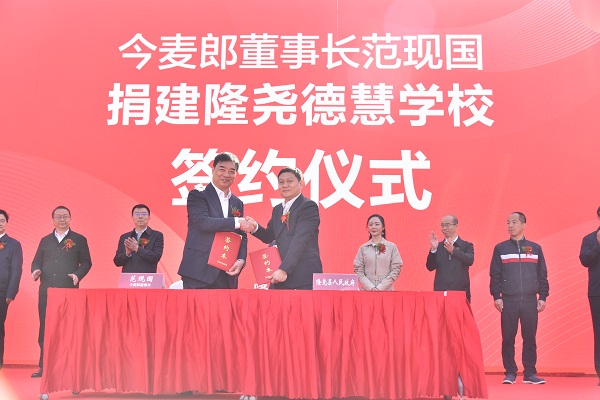 邢台市副市长、隆尧县委书记王文玉在签约仪式上说:“今麦郎集团是隆尧县的支柱企业,先后荣获了全国重点农业产业化龙头企业、中国制造业民营500强企业、全国一二三产业融合领军企业、全国农业国际贸易高质量发展基地等多项荣誉称号。20多年来,今麦郎集团不仅为隆尧县经济发展做出了突出贡献,还积极主动参与社会公益和慈善事业,三年疫情期间向隆尧捐赠2000多万元的现金和物资。今天,范现国董事长再次慷慨解囊,捐建一所价值2亿元的学校,为家乡和国家培养人才,充分展现了他情寄家乡、心系教育的家国情怀,体现了他勇于担当、引领风范的企业家精神。正是这种爱心之举,让隆尧教育的高质量发展有了更好的保障和更大的底气。隆尧县委、县政府将成立专班推动项目建设,确保把德慧学校建成优质工程,把善事办好、实事办实,让捐赠者放心,让老百姓满意。同时,我们真诚地希望更多的企业家和社会爱心人士,见贤思齐,兴教助学,以范现国董事长为榜样,积极参与和支持慈善事业,为全县高质量发展贡献力量!”