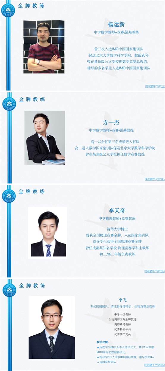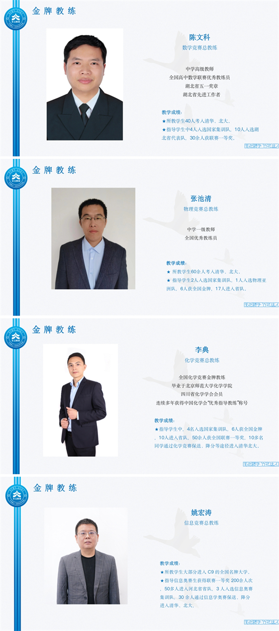 10余位金牌教练,涵盖数学、物理、化学、生物、信息学科领域,我们用竞赛和强基引领名校升学。