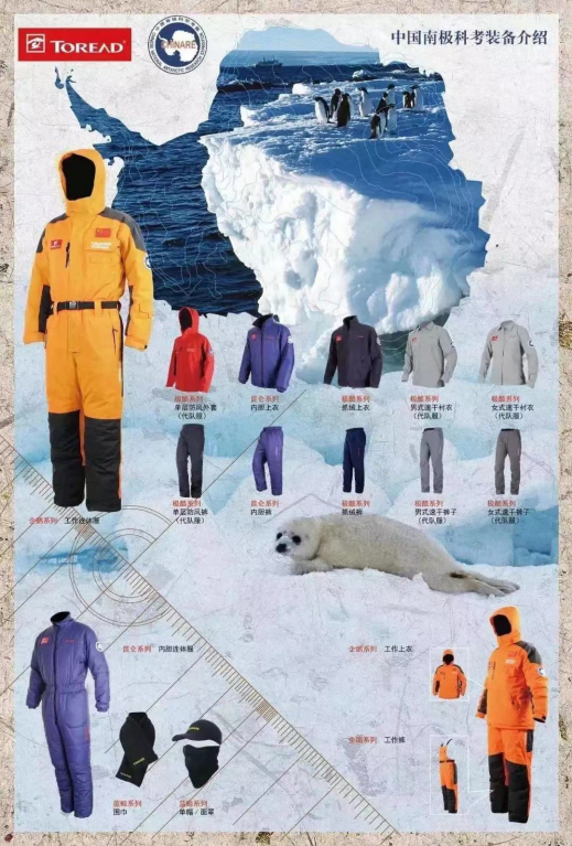 自2009年第26次南极考察任务开始,到2023年第39次南极考察任务凯旋,探路者已经贴身护航中国南(北)极考察队14年了。在本次考察任务中,探路者为考察队员提供了包含企鹅系列极寒连体服(企鹅服)、极酷系列防风外套、昆仑系列内胆裤在内的十余款服装装备。其中,企鹅服能够经受-60℃严酷考验,是考察人员在南极的基本防护服装;“极酷”系列主要用于考察队员日常生活穿着;“昆仑”系列则是防护级别最高的产品。