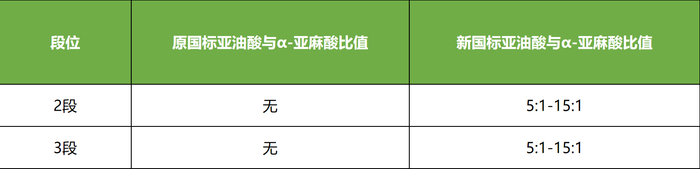 在脂肪含量上, 新国标对二、三段配方奶脂肪中亚油酸与α-亚麻酸的比值进行了规定,使之更利于2-3 岁宝宝的认知能力成长。