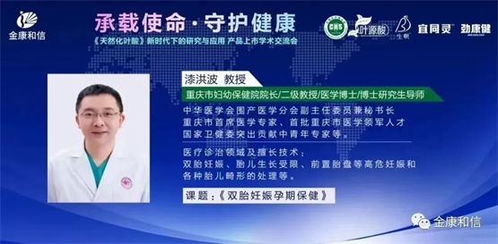 在近期由连云港金康和信药业有限公司主办的《承载使命 守护健康》——天然化(活性)叶酸:新时代下的研究与应用-产品上市学术交流会上,漆洪波教授受邀参加,并围绕双胎妊娠的孕期管理要点展开相关专题报告。分别从孕周的确定、绒毛膜性的确定、双胎标记、孕期体重管理、孕期营养、双胎妊娠的产前筛查与诊断、双胎生长发育评估、双胎的胎心监护(EFM)、产前检查安排、终止妊娠时机十个方面,对孕期全过程需要注意的问题做出详尽列举并给出相应解决方案,为保障母体健康和胎儿发育全面提供了宝贵的参考意见和指导方针。