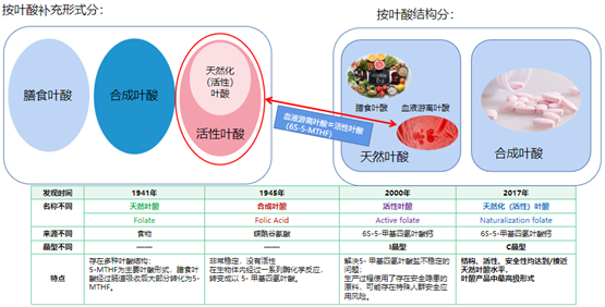 目前,市售叶酸产品多种多样,按照补充形式分为膳食叶酸、合成叶酸、活性叶酸,按结构分为天然叶酸和合成叶酸。1941年发现天然叶酸,主要来源于食物的膳食叶酸;1945年科学家们成功合成了稳定、且价格低廉的合成叶酸。