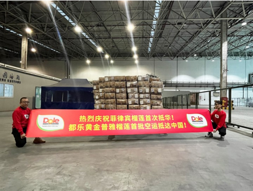 继2023年1月7日海关总署正式公告菲律宾榴莲准入后,首批都乐黄金普雅榴莲于4月7日14时30分在万众期盼下空运抵达中国,后运往上海辉展市场销售。此次空运成功标志着菲律宾新鲜榴莲对华出口的正式启动,都乐也成为中国首批引入菲律宾榴莲的企业之一。