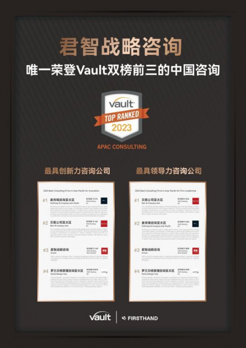 近日,咨询界风向标Vault发布了2023年全球咨询公司排名榜单,中国战略咨询领导者君智咨询,与麦肯锡、贝恩共同入选亚太区最具创新力、最具领导力咨询公司,成为唯一荣登Vault“双榜”并位列前三的中国咨询公司。