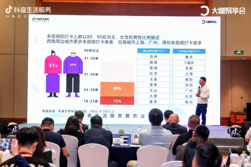 现场,昆明市商务局副局长马晨和抖音集团云南副总经理韩静婷致辞,抖音生活服务商家商品运营高级经理刘爽、抖音生活服务餐饮行业餐饮行业闽湘云大客户总监邢晶、抖音生活服务餐饮行业华西市场总监李俊杰等分析了行业趋势,解读了2023年的平台规划。