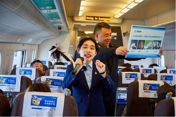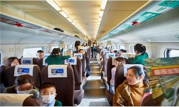 研学专列上,专业的讲解员为同学们介绍了我国高铁营业总里程全球第一的具体情况,并讲述了我国精彩的“铁路文化”,还与同学们展开了互动。