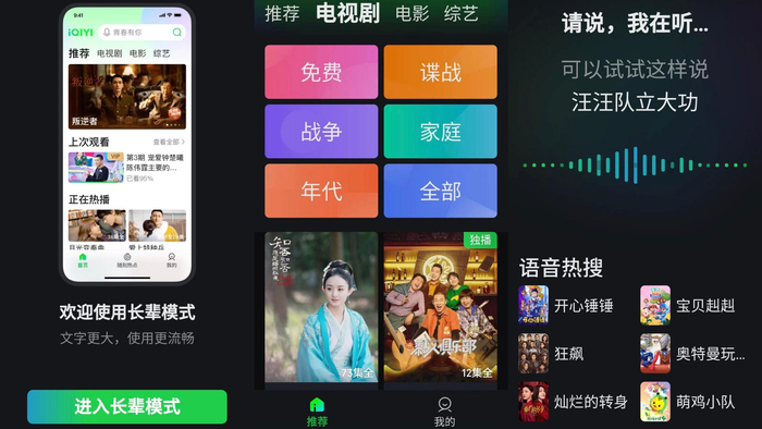 爱奇艺从2021年起,就开始探索APP的适老化和无障碍优化。 打开爱奇艺APP,用户通过“我-设置-长辈模式”中即可开启“长辈模式”。 该模式下,页面使用超大字号,老龄用户不用老花镜也能轻松浏览;频道页中区别于常规排列,采用大卡样式,依据中老年用户常用的标签进行分类,实现精品影视一键直达;考虑到不少老年用户是经典剧集和电影的高频用户,为提高搜索效率,长辈模式搜索框支持语音搜索,用户只需点击搜索框的“小话筒”说出内容名称,即可完成搜索。
