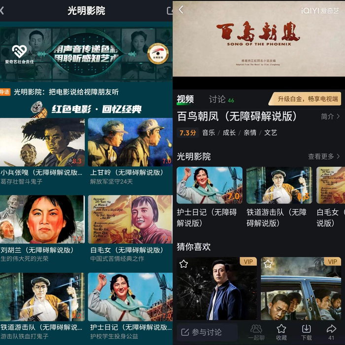 针对视弱用户等特殊群体,爱奇艺也定制化开发了适配读屏、操作更便捷的隐性 “无障碍模式”。在无障碍改造的功能创新方面,爱奇艺APP支持核心场景的焦点适配+读屏,用户可便捷体验找内容、看内容、观影辅助功能、寻求帮助等核心功能。除了功能创新,通过公益频道爱奇艺还上线了“光明影院”,为视弱用户量身定做的无障碍解说版,让“可以听的电影”陪伴用户每一天。目前《百鸟朝凤》《南征北战》《解放·终局营救》《淡蓝琥珀》《一万公里的约定》《一生有你》《等风来》等影片视障解说版已上线,