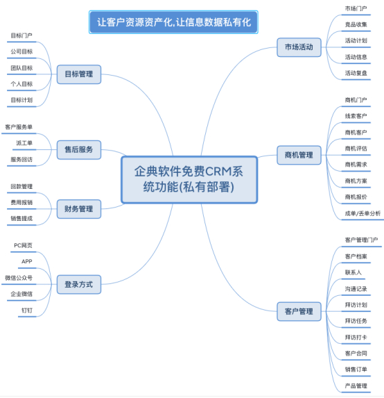 该企典软件免费CRM系统包含功能有:目标管理、市场活动、商机管理、客户管理、售后服务、财务管理、BI数据看板,还支持网页、APP、微信公众号、企业微信、钉钉等多样化登录使用,满足不同客户需求.
